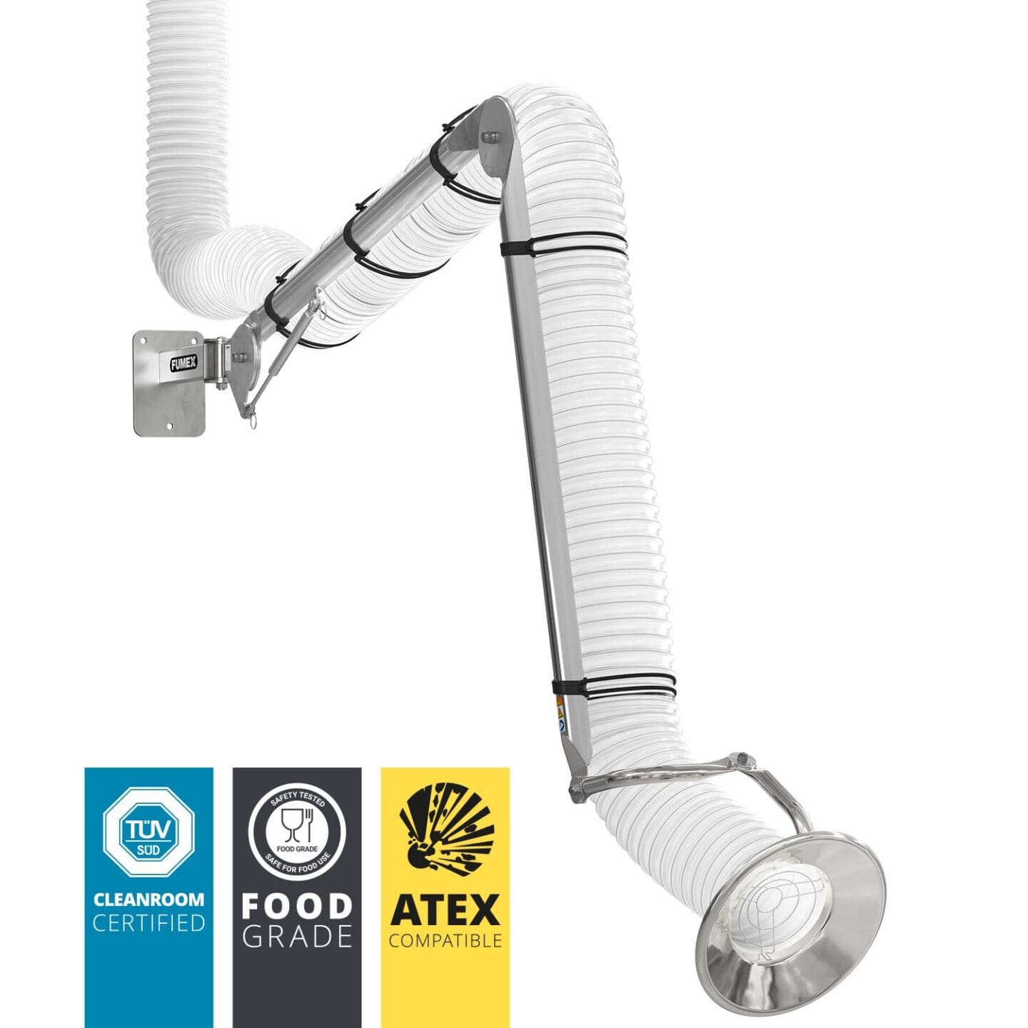 FUMEX PSS – Reinraumzertifizierter Absaugarm mit smarter, stilvoller Konstruktion, vorrangig für Industriebranchen mit hohen Hygieneanforderungen, wie z. B. die Lebensmittel- und die Pharmaindustrie.